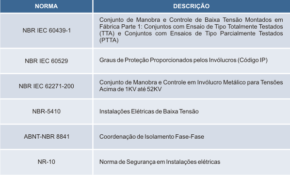 Abaixo relação de entidades de normas regionais e internacionais utilizadas para o projeto e execução de painéis elétricos como conjuntos de manobra e comando de baixa tensão: